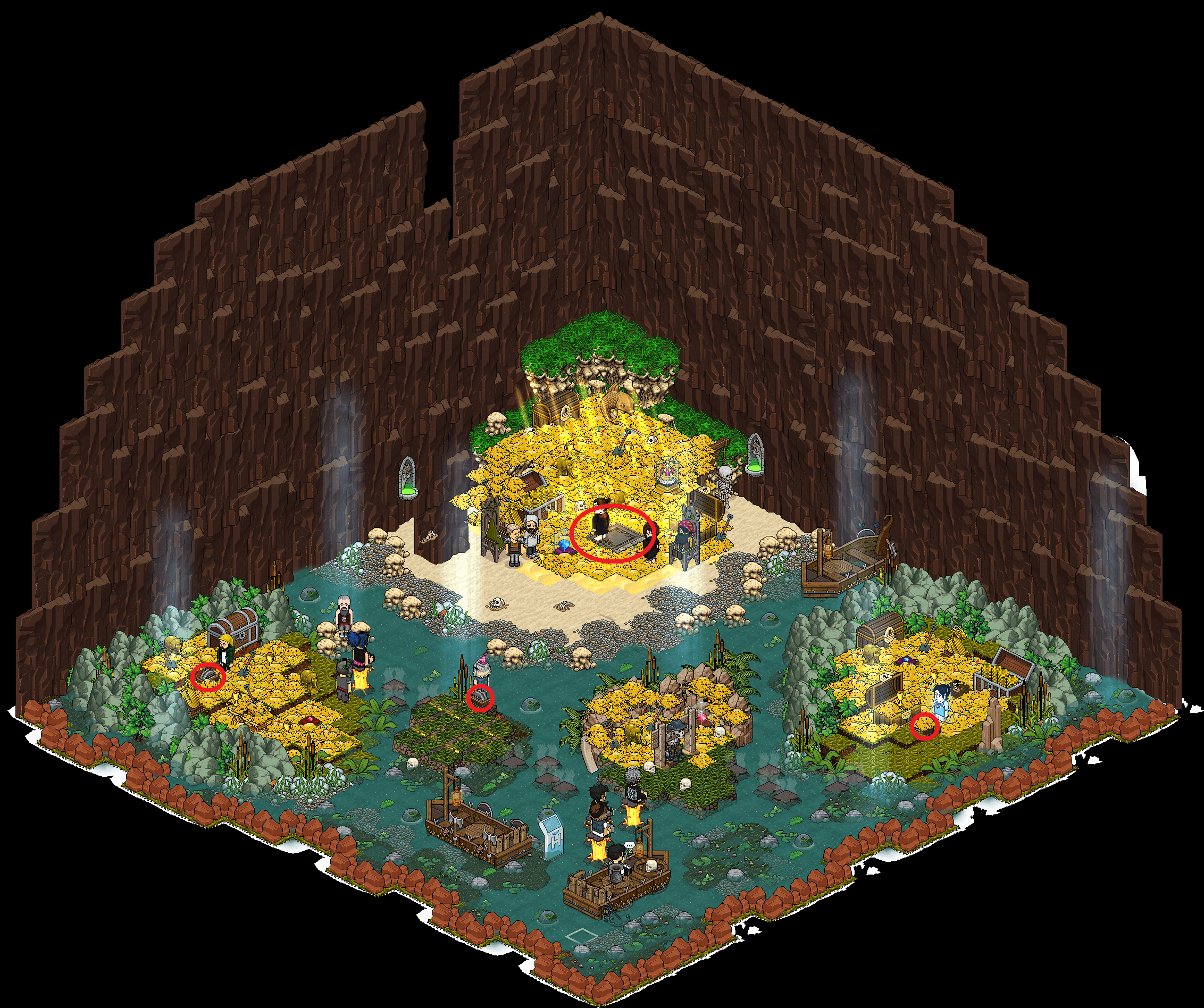 Primeramente tendrás que entrar a la sala Tesoro de Habbo – La cueva de Sefos, y tendrás que caminar por la sala ayudándote de los asientos de lava que hay (si pisas el agua serás kickeado).
