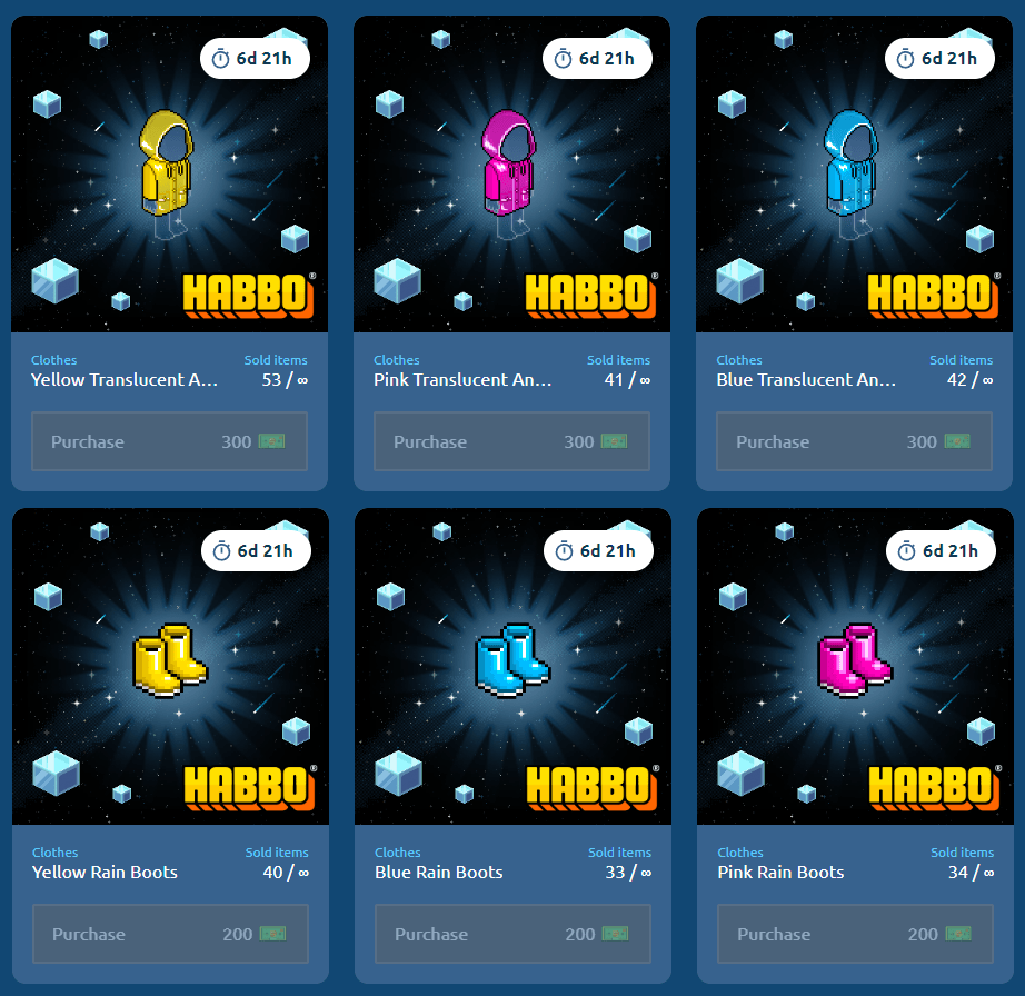 [NFT] En venta: Anoraks translúcidos y Botas de lluvia Hace 3 años Kyovyan 10 Popular Archivada Información de la publicación Publicada: 14/09/2023 12:31:00 H.P.E. Autor: Kyovyan Último comentario:@ngelytox Ir Visitas: 573 Información general Categoría: Prendas en venta Tipo: Prenda NFT Precio: 200 y 300 Fecha de inicio de venta: 14/09/2023 Fecha de final de venta: 21/09/2023 Lugar de venta: Tienda NFT Imagen + Tienda NFT Ir a la Tienda NFT
