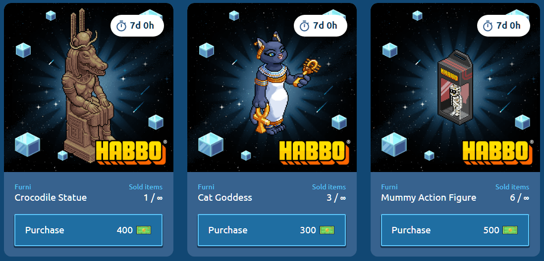 [NFT] En venta: Figura de Acción Momia, Estatua Cocodrilo y Diosa Gato Hace 3 años Dantempo 6 Popular Archivada Información de la publicación Publicada: 25/10/2023 13:03:28 H.P.E. Actualización: 26/10/2023 17:14:10 H.P.E. Autor: Dantempo Último comentario:@ngelytox Ir Visitas: 462 Información general Categoría: Furnis en venta Tipo: Furni NFT Precio: 300 , 400 y 500 Fecha de inicio de venta: 25/10/2023 Fecha de final de venta: 01/11/2023 Lugar de venta: Tienda NFT Disponible en BC: No Imagen de los furnis y Tienda NFT Ir a la Tienda NFT