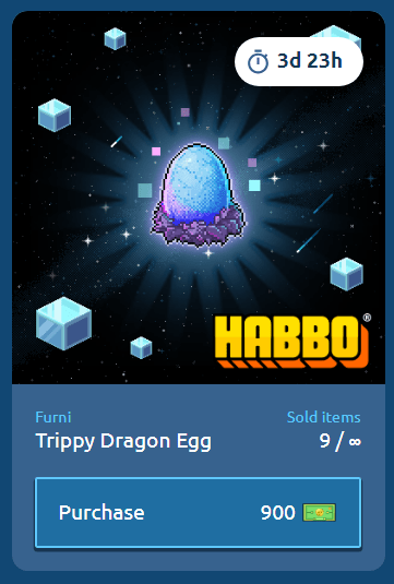 [NFT] En venta: Huevo de Dragón Trippy Hace 3 años Kyovyan 4 Popular Archivada Información de la publicación Publicada: 08/06/2023 13:22:28 H.P.E. Autor: Kyovyan Último comentario:@ngelytox Ir Visitas: 369 Información general Categoría: Furni en venta Tipo: Furni NFT Precio: 900 Fecha de inicio de venta: 08/06/2023 Fecha de final de venta: 12/06/2023 Lugar de venta: Tienda NFT Imagen del furni + Tienda NFT Ir a la Tienda NFT
