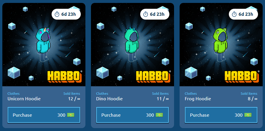 [NFT] En venta: Sudaderas rana, dino y unicornio Hace 3 años Dantempo 17 Popular Archivada Información de la publicación Publicada: 23/08/2023 13:04:23 H.P.E. Autor: Dantempo Último comentario:@ngelytox Ir Visitas: 750 Información general Categoría: Prendas en venta Tipo: Prenda NFT Precio: 300 Fecha de inicio de venta: 23/08/2023 Fecha de final de venta: 30/08/2023 Lugar de venta: Tienda NFT Disponible en BC: No Imagen + Tienda NFT Ir a la Tienda NFT Canjea el código en la sala [HT] CENTRAL NINTENDO de Tooxe, para sumar puntos en la dinámica ¡Caza Pokemon!