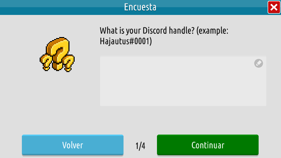 Pregunta 1: ¿Cuál es el nombre de tu cuenta de Discord? Por ejemplo, HabboTemplarios#0001.