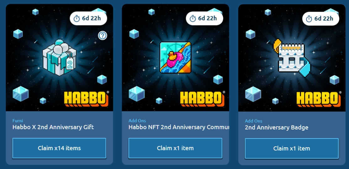 Asimismo, quienes ganaron en el juego Birthday Event pueden reclamar una caja de regalos Habbo X por cada vez ganada y una única placa.
