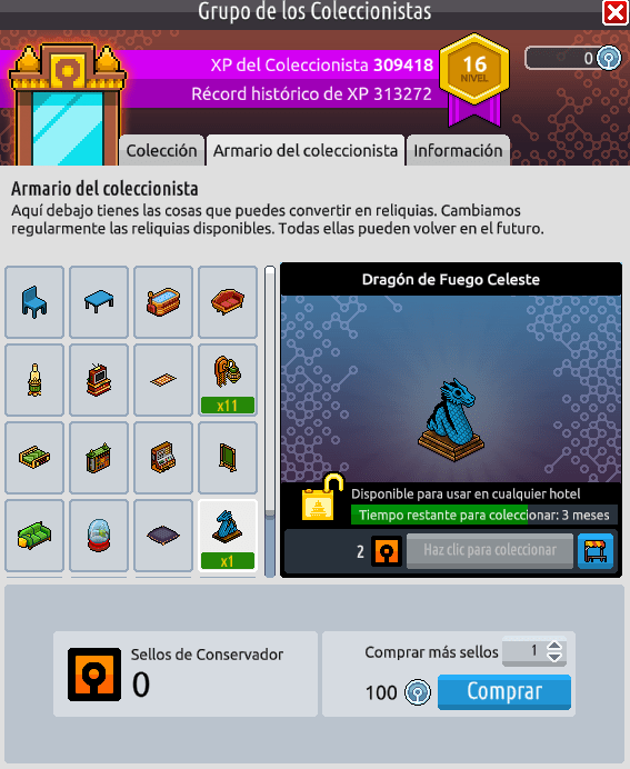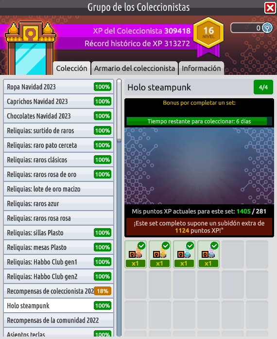 Podrás conseguir experiencia de coleccionista por cada ítem coleccionable que poseas, ya sea un normal (furni, ropa, mascotas o add ons) o premium (avatares, portraits y rooms): cuanto mayor nivel tengas, mejores serán las ventajas que conseguirás en el futuro.