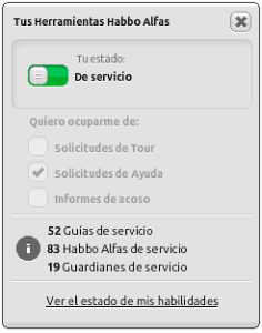 La herramienta de Guardián fue deshabilitada pasado un tiempo debido al mal uso de esta y la de Habbo Alfa desapareció con la llegada de Habbo 2020. Pero por lo visto ya se está trabajando en una nueva herramienta de ayuda.