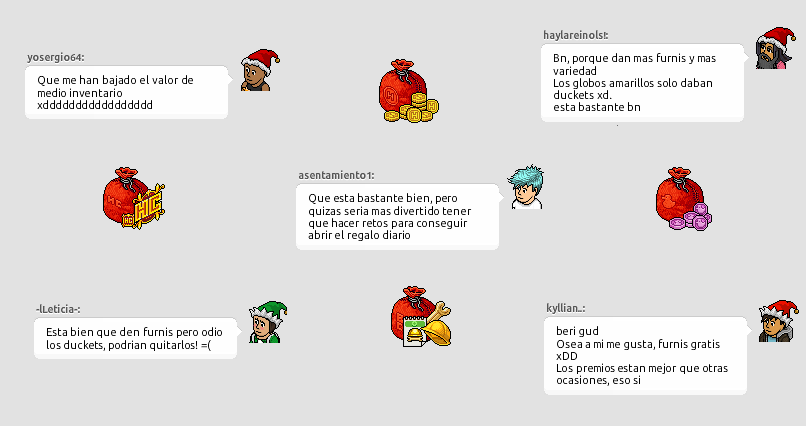 Un domingo más estamos aquí para sacarte una sonrisa con la Voz de Habbo. Tras una dura semana de búsqueda para encontrar una buena pregunta nos topamos con el Calendario de Adviento. Leíamos los spams de los usuarios en los que agradecían los regalos que les tocaban y otros, no tan buenos, en que se quejaban de los duckets o de los furnis que tocaban.
