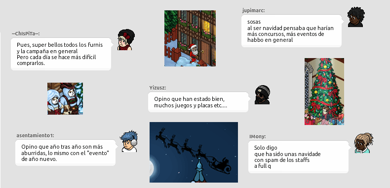 Esta semana acab贸 un gran evento que empez贸 en diciembre. Un evento acompa帽ado por juegos, furnis, lotes de sala y muchos raros. Nosotros sentimos curiosidad por saber la opini贸n de los usuarios sobre este gran eventos, por dicho motivo esta semana salimos por las salas de habbo y preguntamos a los usuarios qu茅 les pareci贸 el evento de Navidad que organiz贸 Habbo: