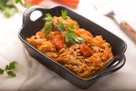 Bigos: Es considerado plato nacional de Polonia, es una clase de estofado a base de col (chucrut) y varios tipos de carne, especialmente la kielbasa (salchicha polaca), setas secas y ciruelas secas, también se le añaden carnes frescas.