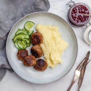 Kötbullar: Albóndigas de carne que se suelen servir bajo una salsa de carne, acompañadas de patata, generalmente en forma de puré y con mermelada de arándano rojo (“Lingonberry”).