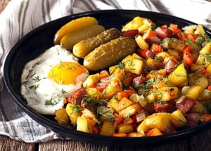Pyttipanna: Es una comida variada hecha en trocitos, tradicionalmente consiste en patata (papa), cebolla, y cualquier tipo de carne o salchicha, todo ello en cubos y frito en sarten, suele servirse con huevo frito, remolacha encurtida en trozos, pepinillos y alcaparras.