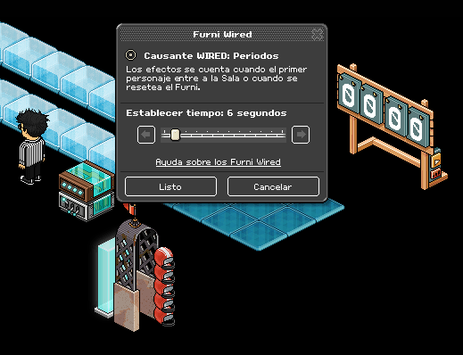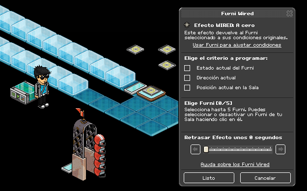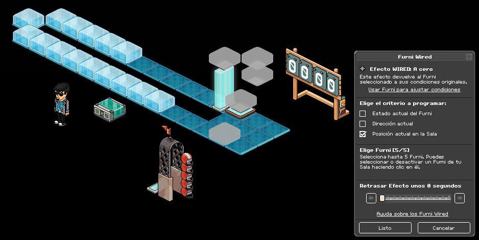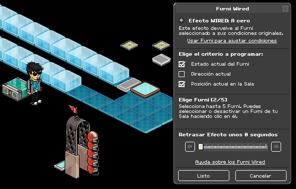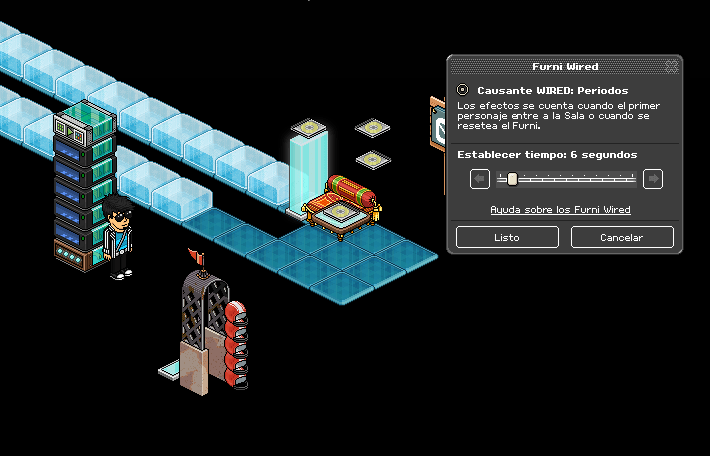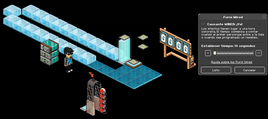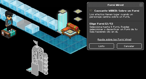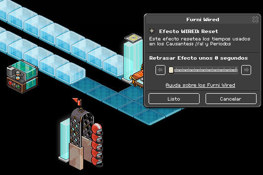 Paso 13: cogemos un causante wired: sobre un furni y seleccionamos el vestidor freeze, y el bloque freeze que te mostramos.