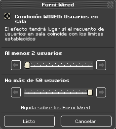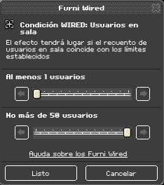 Esta condición wired lo que hace es que una pila wired se active cuando se establezcan los parámetros establecidos. Tendremos que indicar la cantidad de usuarios máximos y la cantidad de usuarios mínimos que debe haber en una sala para que la pila wired se active.